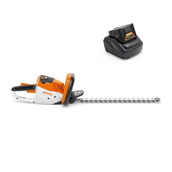 for trimming bushes and hedges around the home. Single-sided cutter blade with 30-mm tooth spacing, integrated cut protection in a droplet shape, and screw-on blade tip protector. Comes with AK 10 battery and AL 101 charger as standard.