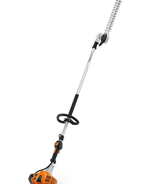 Lightweight cordless long-reach hedge trimmer for cutting taller hedges and shrubs in your home garden. Single-sided cutter blade in a droplet shape, variably adjusted blade angle from -45° to +90°, detachable shaft for easy transport. Carrying length: 115 cm. Total length: 210 cm.